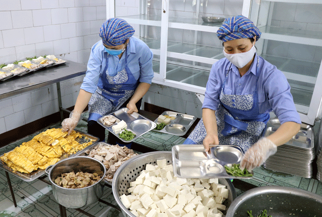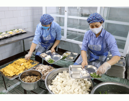Quy trình kiểm soát nghiêm ngặt: nhập hàng, lưu kho, chế biến, chia phần theo khay và phục vụ.
